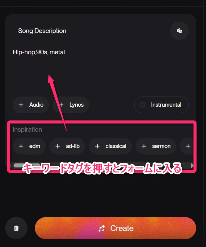 Song Descriptionの中にプロンプトを入れてCreateボタンを押すだけです。