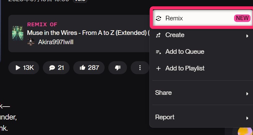 「Based on」の項目で、元になる曲を指定するため、一度曲を生成してから使う機能となっています。
