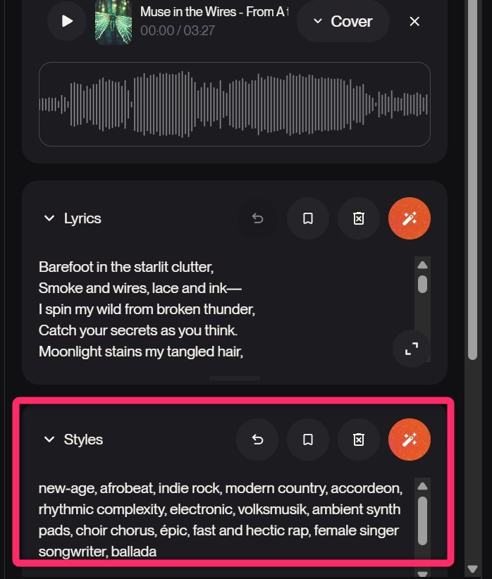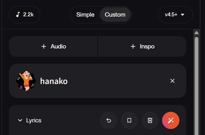 CustomモードではLyricsにオリジナルの歌詞を入れたり、Stylesにプロンプトを細かく記載して曲の雰囲気をSUNOに伝えてから曲の生成が可能です。