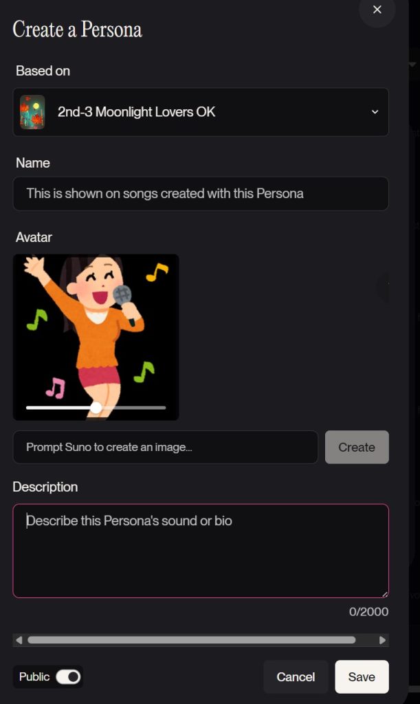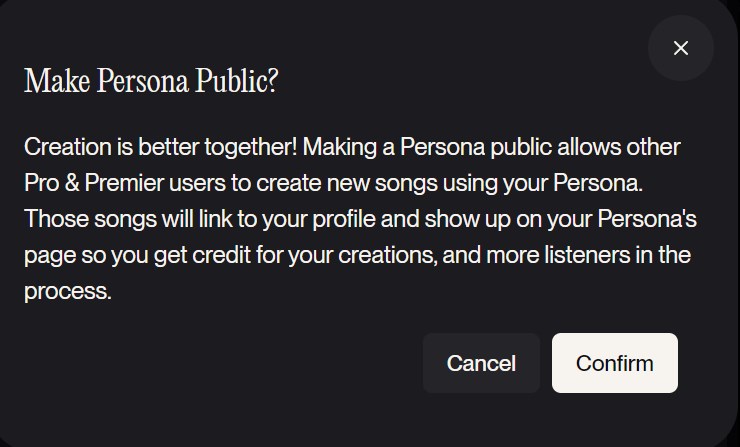Creation is better together! Making a Persona public allows other Pro & Premier users to create new songs using your Persona. Those songs will link to your profile and show up on your Persona’s page so you get credit for your creations, and more listeners in the process.