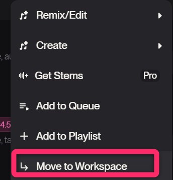 生成した曲のWorkspaceを動かすときには「Move to Workspace」で移動先を指定します。