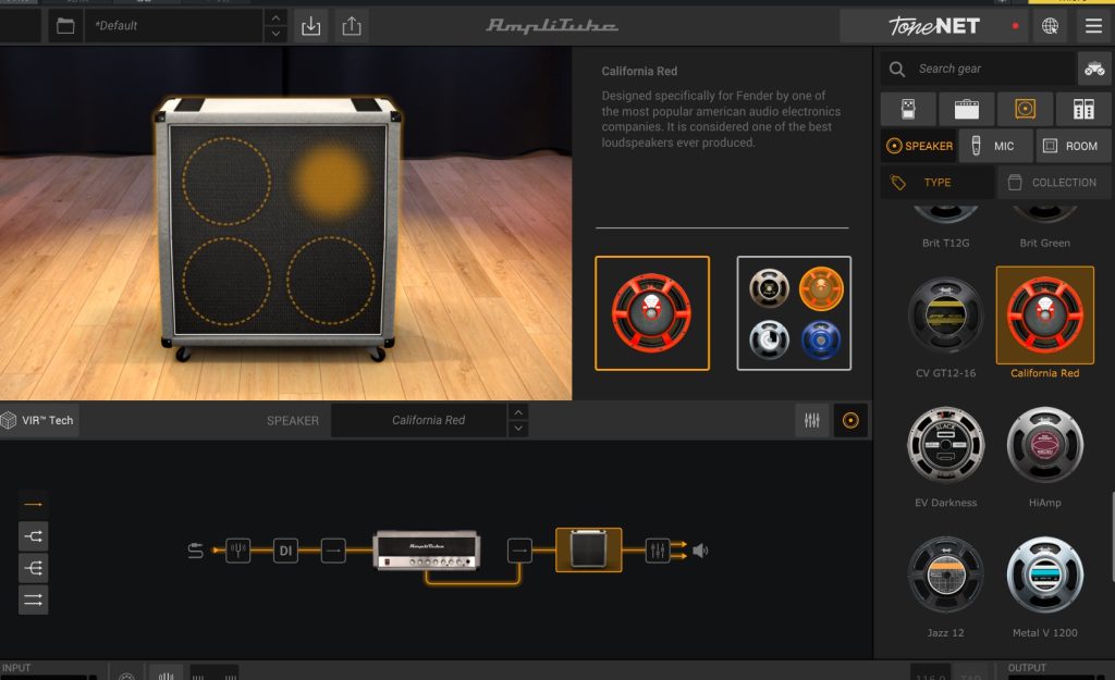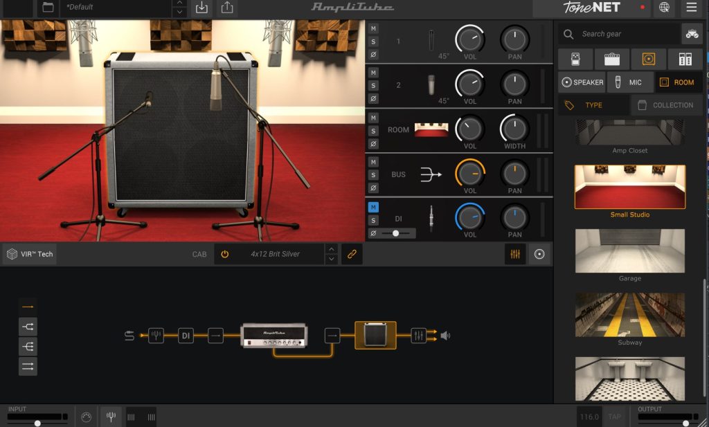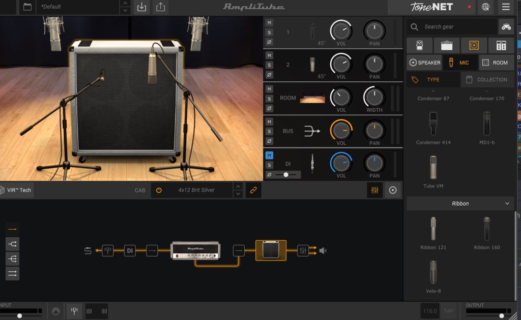 AmpliTube ではキャビネット内のスピーカーごとに違うモデルを割り当てたり、マイクの種類・ポジション、ルーム環境の設定を細かくシュミレーションできます。
