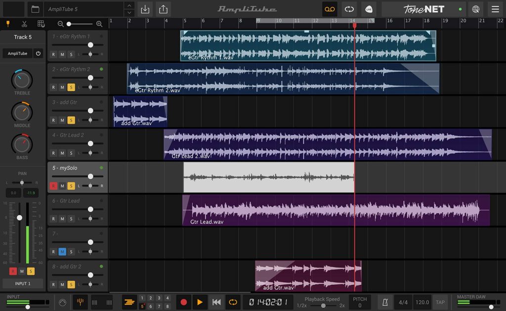 スタンドアローンでAmpliTubeを立ち上げたときは最大8トラックまで使えるレコーダーが起動できます。