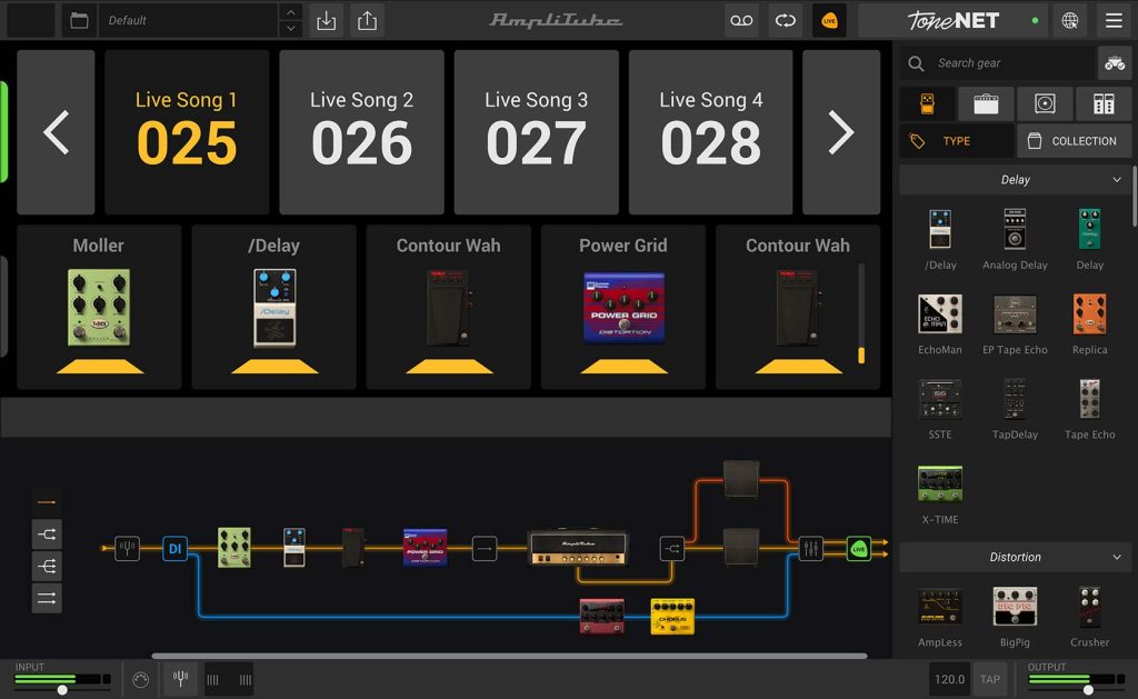 オーディオインターフェースの「iRig Stomp I/O と AXE I/O 」使用時には、ライブモードが使えてAmpliTube をライブパッチとして利用することができます。