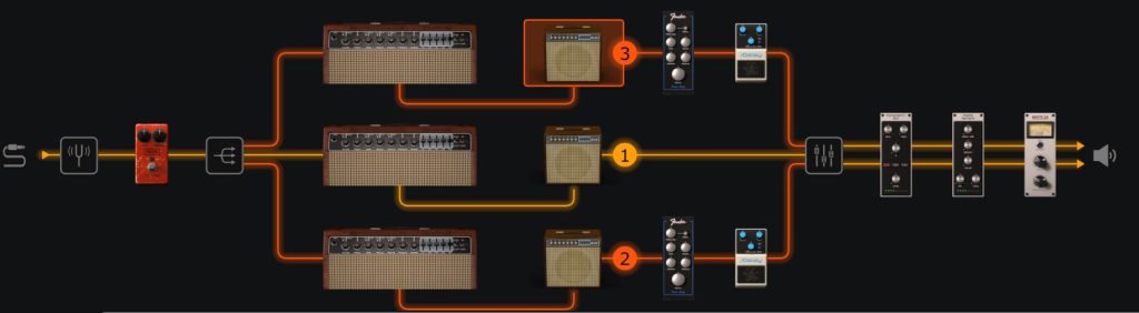 AmpliTube 5 MAX だとアンプ+キャビネットの信号を最大3台パラレルで鳴らせます 。