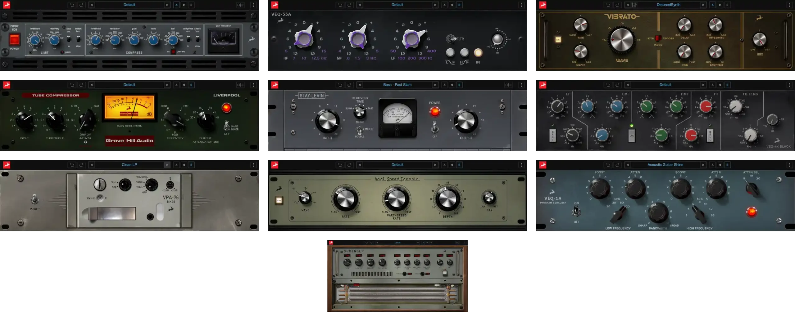 Tubechild670 : 史上最も有名で高価なFairchild 670を再現。ロックやポップスの黄金期を支えたサウンドで、20本の真空管と14個のトランスを忠実に再現 し、自然な厚みと音楽的な粘りを加えます。