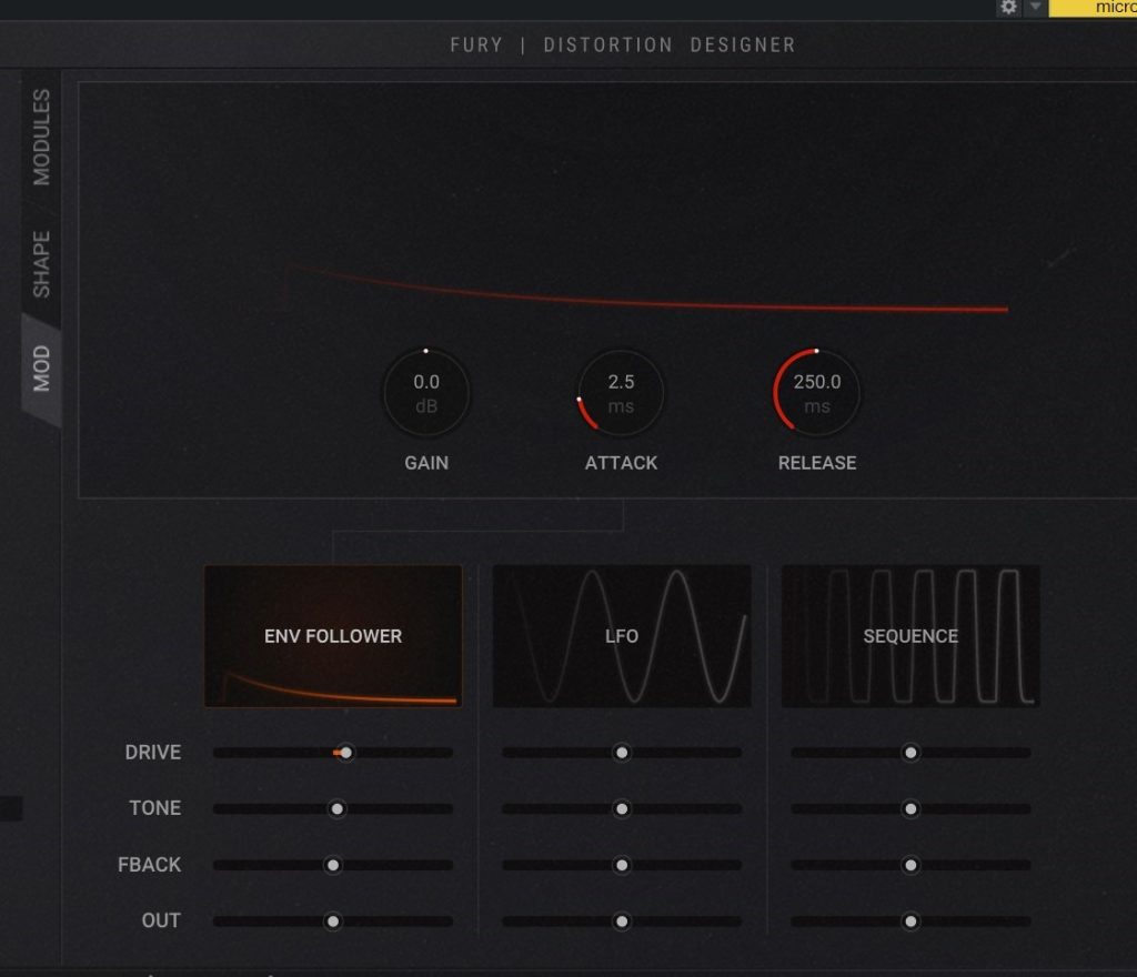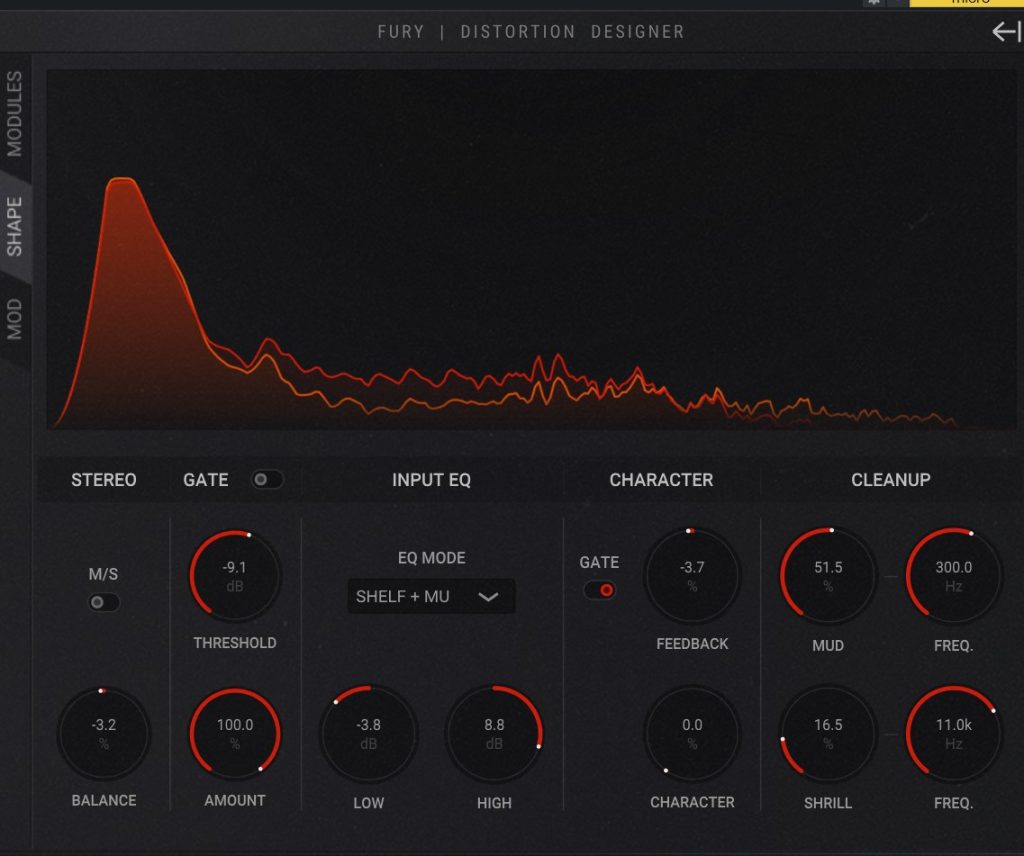 モジュールタブでディストーションの組み合わせを選びます。Shapeタブで音の加工をおこおない、MODタブでモジュレーションの設定を行えます。