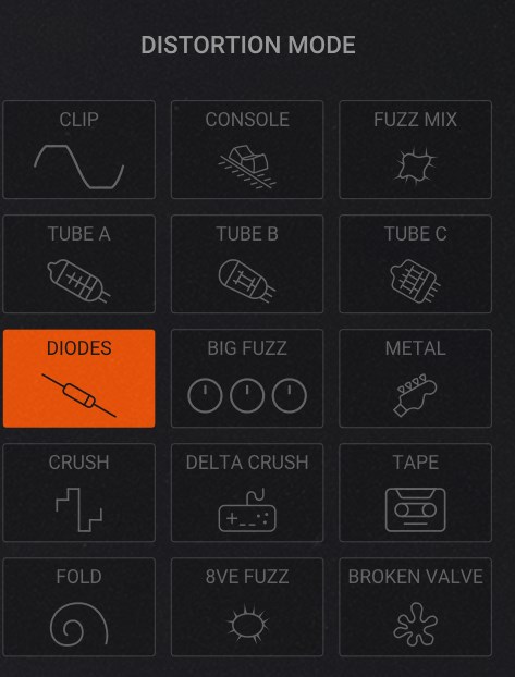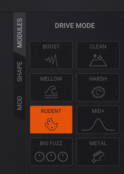 Drive mode+ Distortion mode + Tone modeのモジュールにわかれていて、モジュールの組み合わせで非常に幅広い音作りが可能になっています。
