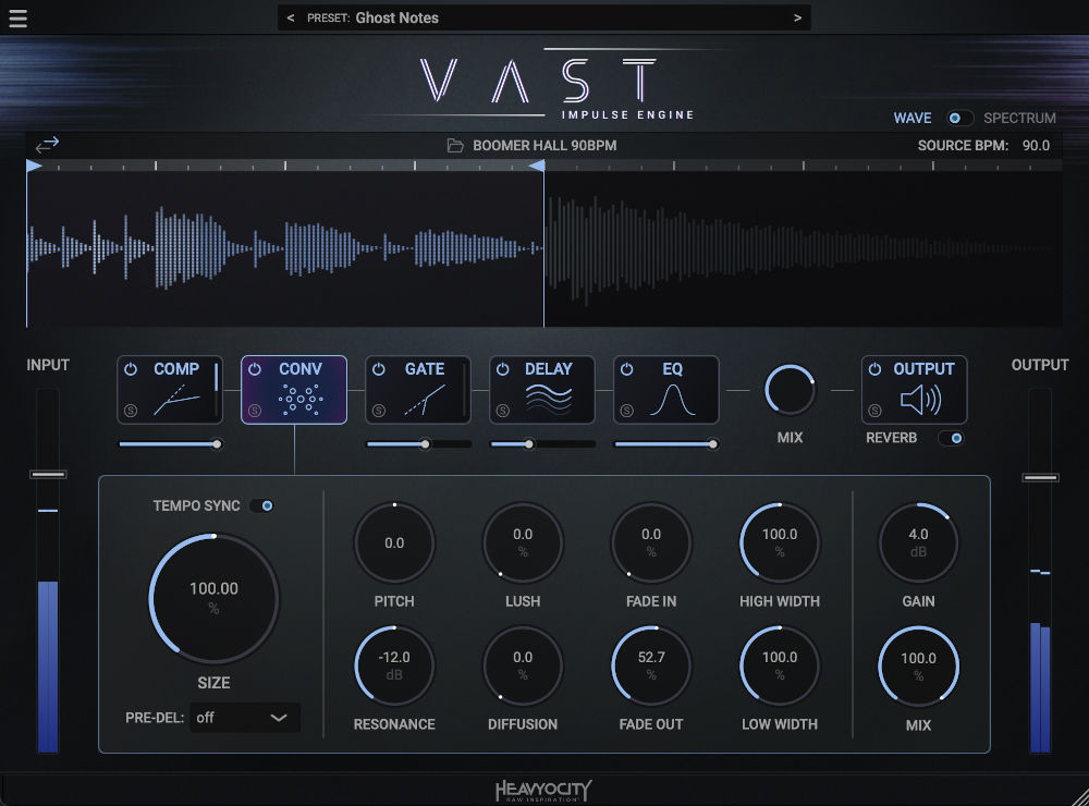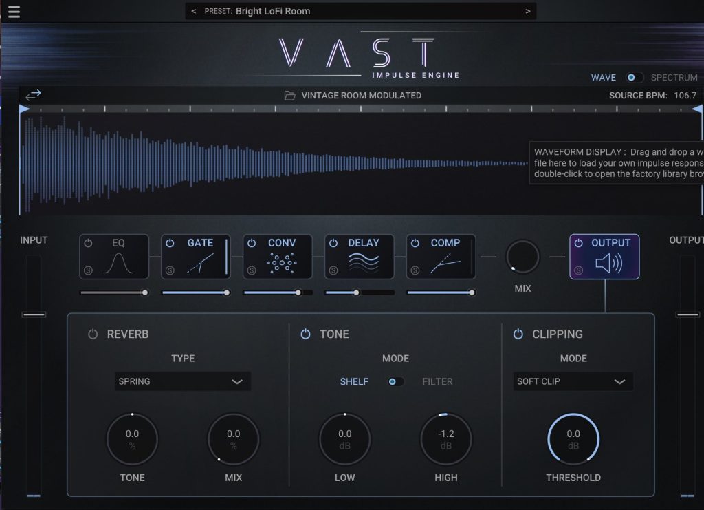 コンプやゲート、ディレイなどが定番のエフェクトが並びます。その中でもVASTの特徴的なのがコンボリューション リバーブモジュール。
