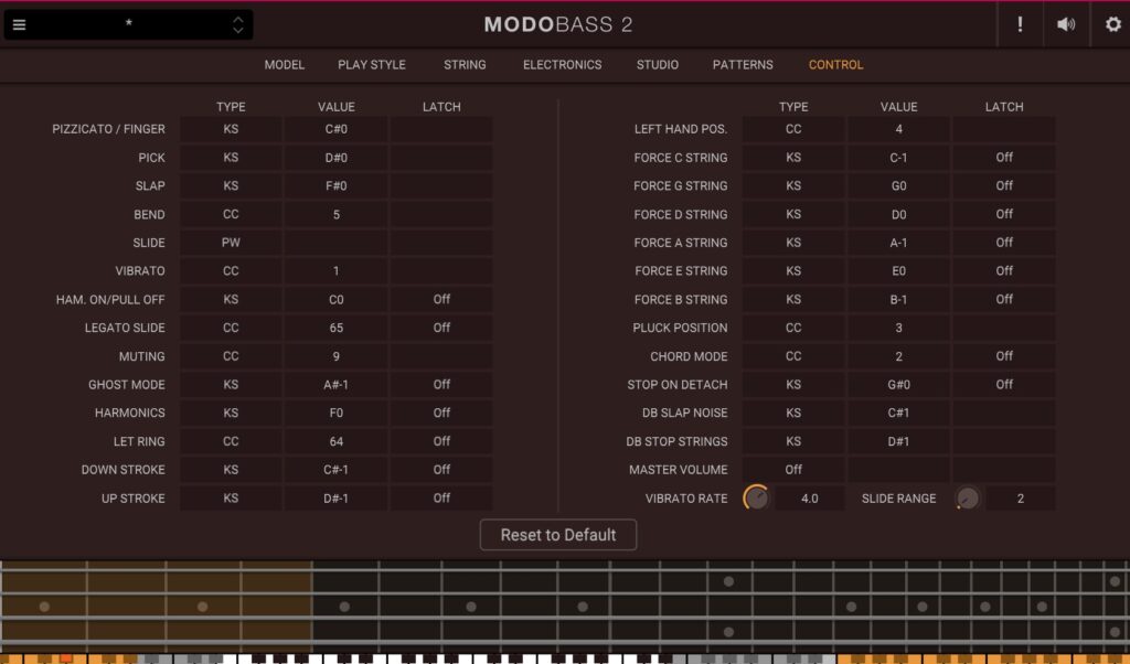 MODO BASS 2の奏法切り替えはキースイッチで行う。