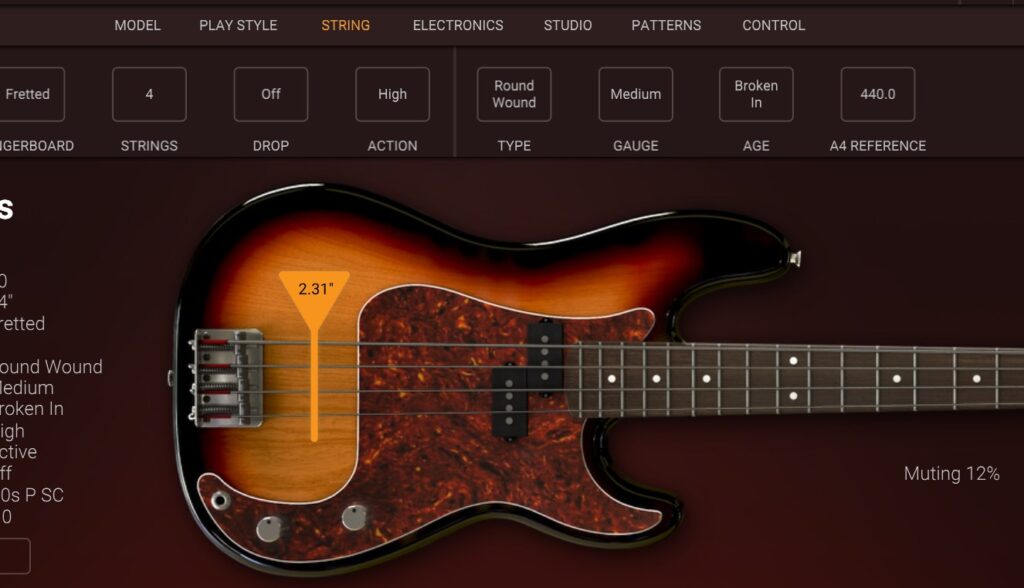 MODO BASS 2には弦のゲージ・コンディション(新品〜使い込んだ弦)・32種類のピックアップモデル・ピックアップの位置調整という細かいカスタマイズが用意されている。