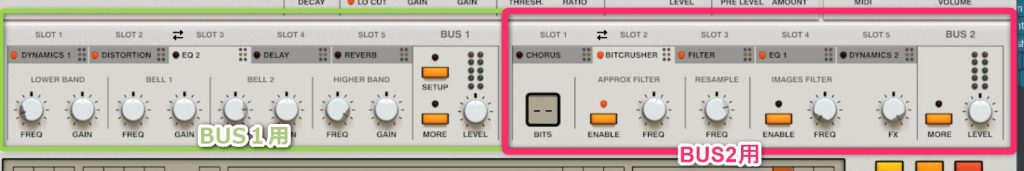 BUSは2つありどちらかを選択。BUS内で使えるエフェクトを通った音に加工できます。