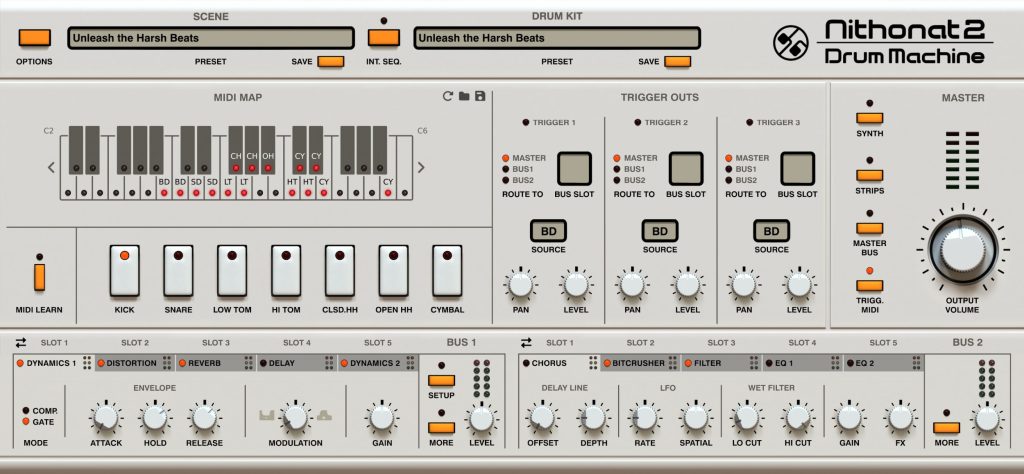 また、ビットクラッシャー、コンプレッサー、フィルター、コーラス、ディレイ、ディストーション、リバーブ、EQ から選択できる 5 つのエフェクトスロットを備えた 2 つのエフェクト バスもあります。(スロットのエフェクトは固定で配置は変更可あ)