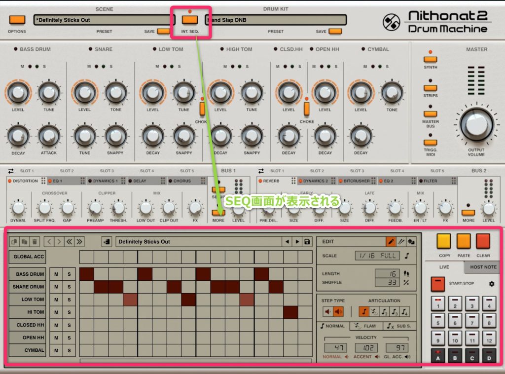 画面上にある「INT.SEQ」のボタンを押すとシーケンサーが表示されます。