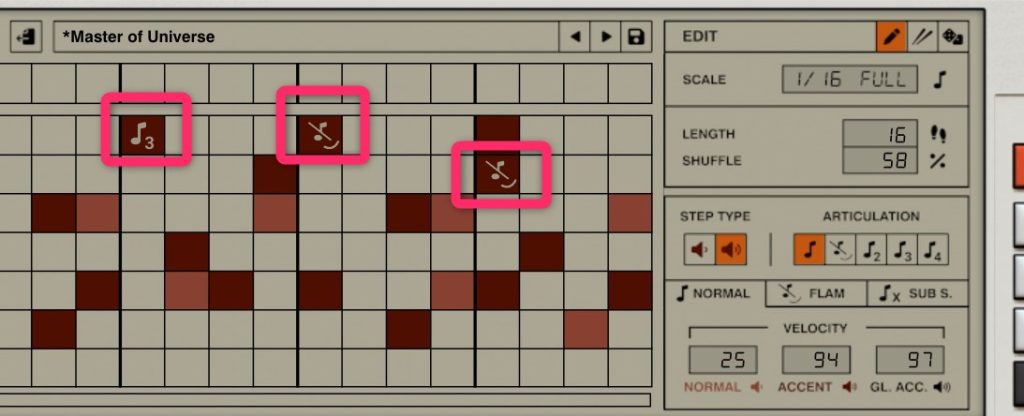 ステップの中に複数回鳴らす指定ができたり、フラムにしたりと細かく調整できます。