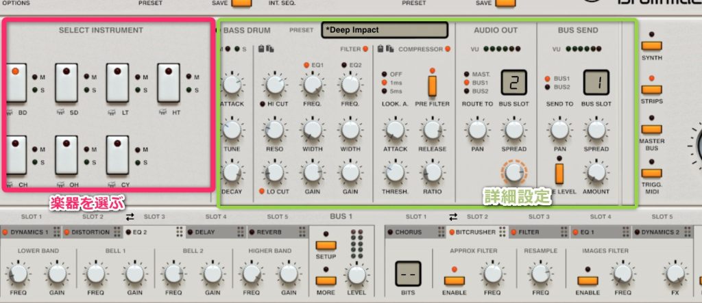 STRIPSセクションでは、各楽器の細かい設定が可能です。