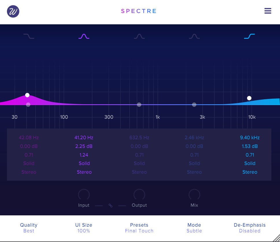 Spectre は5バンド対応のエンハンサーです。EQのように簡単に扱えて、10タイプのサチュレーション(Color)を選びトーンをシェイピングしていくことができます。EQのように操作できますが、-dBのカットができないのが特徴です。