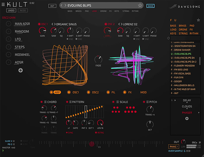 Tracktion Dawesome Kult はDawesomeによるシンセの中では1番とっつきやすいシンセです。波形の形がミュージシャンのインスピレーションを引き立てる作りになっていて、独自のオシレーターにFMやAMで変化を加えていきます。