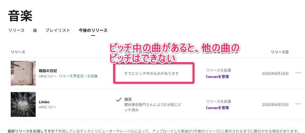 ◯ピッチ提出済の曲が1つあると配信されるまで他の曲はピッチできない