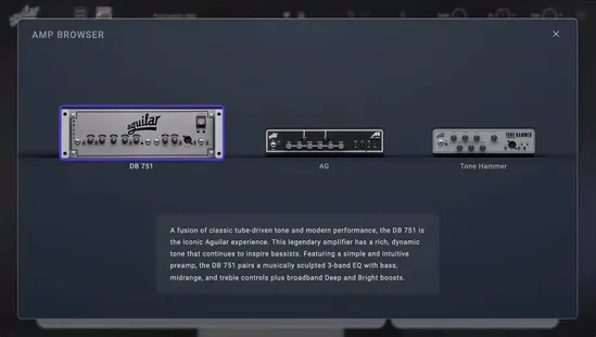 Aguilar Plug-in Suiteの最大の魅力は、なんといってもその収録ギアの豪華さにあります。Aguilarのラインナップの中でも特に人気が高く、多くのプロベーシストに愛用されているアンプヘッドとエフェクターが惜しげもなく投入されています。