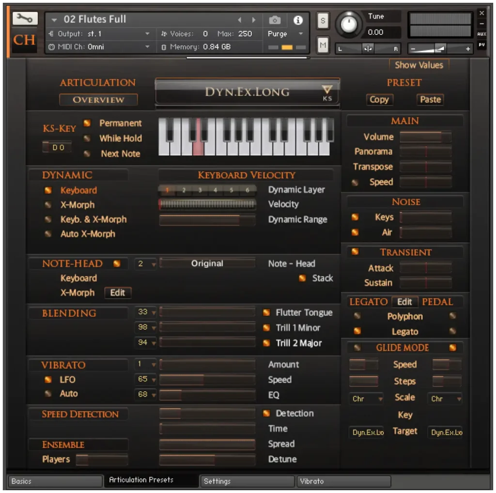 各楽器Extended Rangeの音が鳴らせます。ガチガチのクラッシック楽器再現だと、本来の楽器が出せない音域は鳴らないようになっていますが、Chris Hein Winds Ensembleだと音域を広く鳴らせて楽器の入れ替えをしなくて良いため切り替えの手間が省けます。リアルさは欠けてしまうのですが、利便性を優先しているのだと思います。