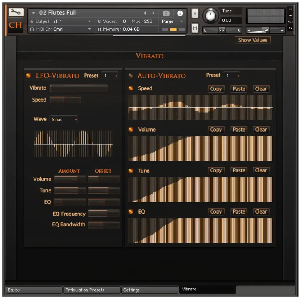 もっと人間っぽさを出すために不規則な動きのビブラートにしたい場合は右側にあるAuto-Vibratoを選択。こちらも5つプリセットがあります。どちらもカスタマイズできるのでつかいやすい方を選択できます。