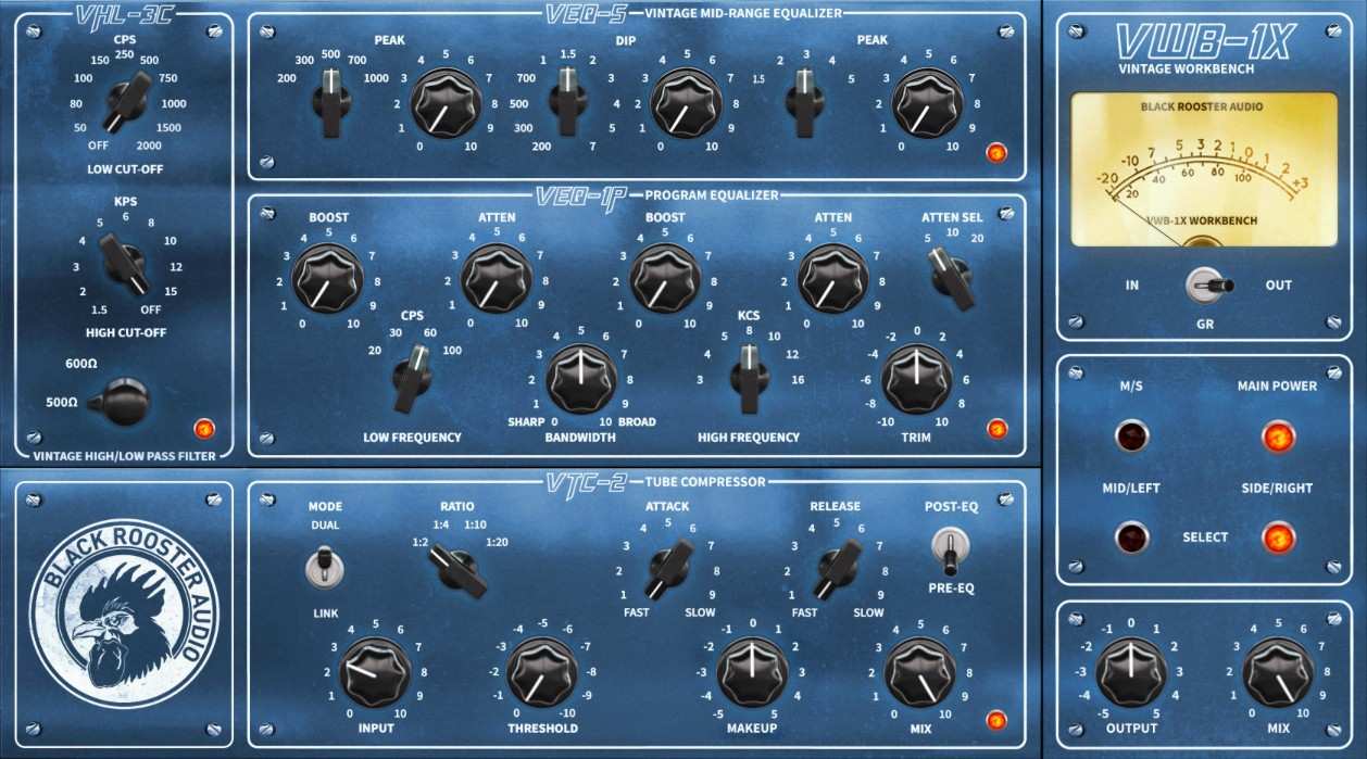 [!NOTE] コンポーネント・モデリング : アナログ機器の回路図上のコンデンサ、抵抗、真空管などの個々の部品の振る舞いを、数学的なアルゴリズムで一つずつ再現する高度なシミュレーション技術。 VWB-1X : Black Rooster Audioが開発した、ヴィンテージ機器統合型のチャネルストリップ・プラグイン。
