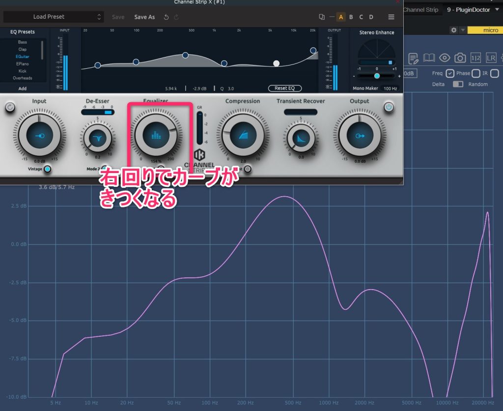 いずれも周波数、ゲイン、Qを調整できます。Qはゲインと反比例関係にあり、ゲインが高いほどQの値も大きくなります。EQのノブを回すとEQカーブがキツくなります。