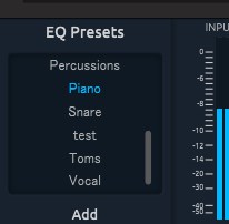 EQプリセットはEQ編集後、ADDを押し名前を決めると保存。右クリックメニューより削除とリネームが可能です。