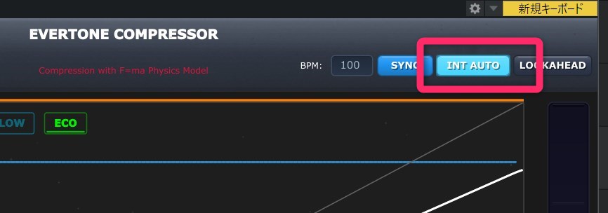 まず、最もユニークなパラメーターが「RANGE」「INT AUTO」です。 通常のコンプレッサーでは、スレッショルドを下げて圧縮量を決めますが、Evertone Compressorでは「この音をどの程度のダイナミクス範囲の中に収めたいか」という視点で調整を行います。