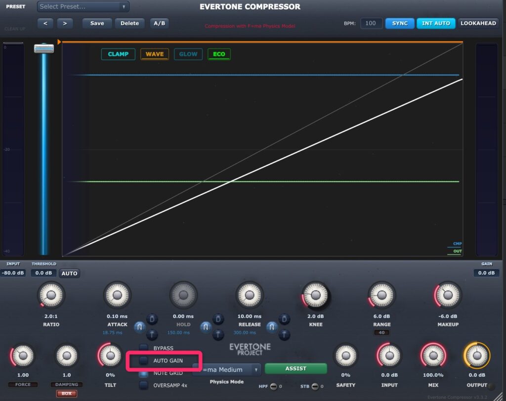 • 波形表示画面を見ながらエフェクトの掛かりをチェックし、いい感じになったらAUTO GAINでレベルを整える。( ThresholdのAutoを押してもAUTO GainがONになります)
