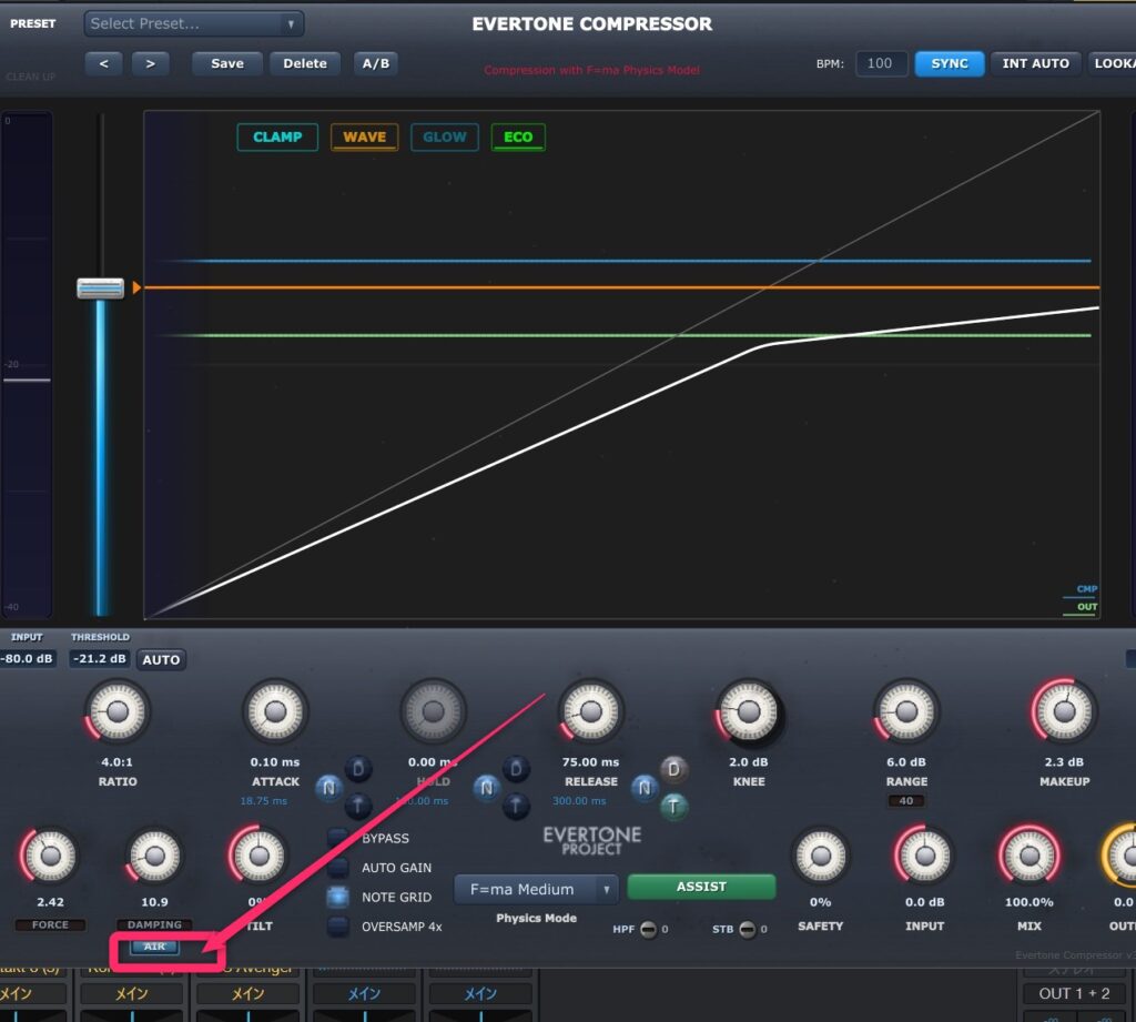 対するAIRモードは、音が空気中に解けていくような、自然で開放的なリリースを再現します。物理的な「空気の抵抗」を感じさせるような、滑らかな戻り具合です。リードボーカルやアコースティック楽器、オーバーヘッドなどに使うと、高域の伸びが非常に美しくなり、透明感を得られます。