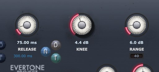 Evertone Compressorの操作パネル中央にあるKNEEノブは、ダブルクリックすることで詳細な調整画面がポップアップします。ここには、視覚的に動作を確認できる「アークライト(弧状のインジケーター)」が表示されます。