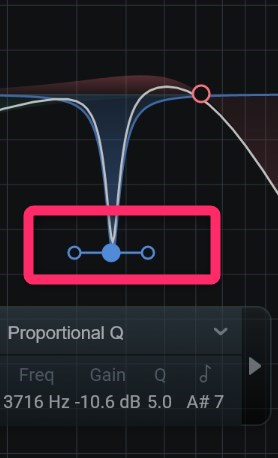 NeutronのEQはEQバンドのハンドルが表示されるため、痛い所を抑えるノッチフィルターとして使うときには素早く設定可能です。