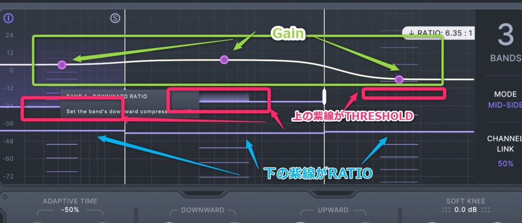 バンド毎にコンプのレシオとスレッショルドを調整するときはディスプレイ上から、バンド毎に調整します。