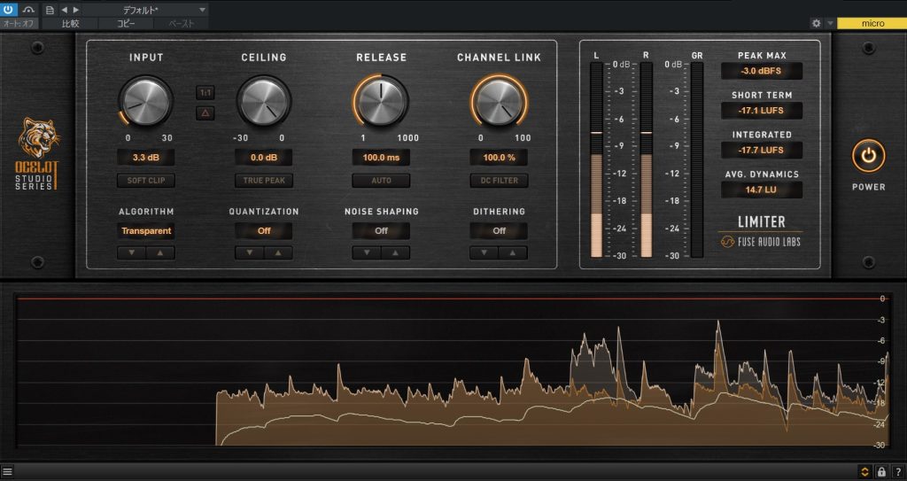 OCELOT Limiterはものすごく優秀なリミッターで、INPUTをモリモリにしても全然歪みません。(INPUTは+30dB まで設定可能)