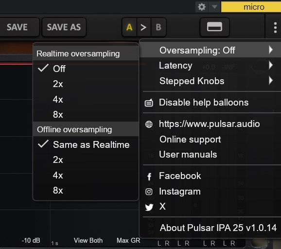 そしてCliperとリミッターがついていて、先読みのためオーバーサンプリングONにするとリミッターは使えませんがこれがまた便利です。(ゼロレイテンシーモードとオーバーサンプリングモードが選べます)