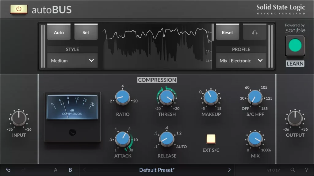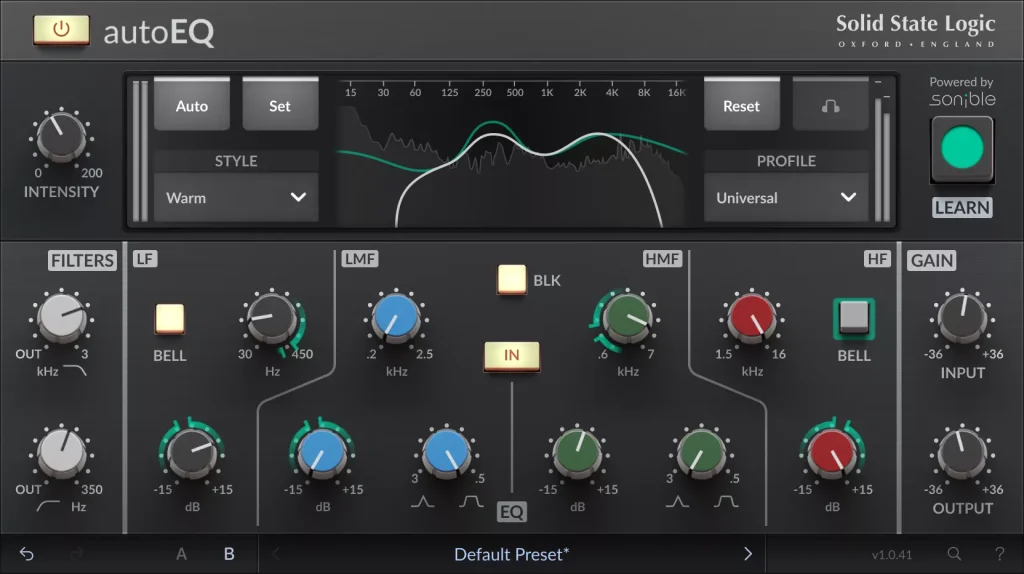 多くのDTMユーザーが抱えるこうした悩みに対する、SSLからの回答が「auto」機能です。本バンドルの最大の特徴は、ソース音源を再生して「Learn」ボタンを押すだけで、AIが数秒で適切なパラメータ設定を提案してくれる点にあります。