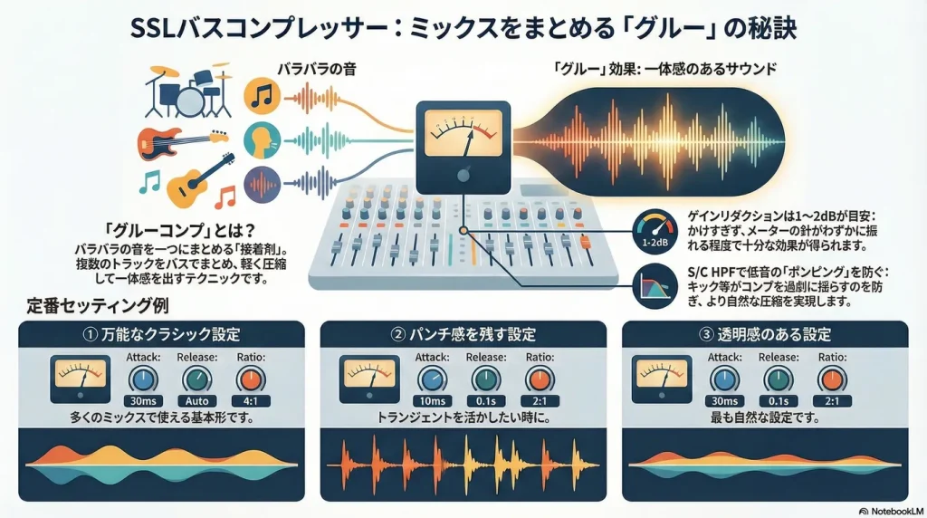 グルーコンプ と呼ばれることもありますが、グルーは「接着剤」という意味で、バラバラだった音をまとめる効果を強調した呼び名です。