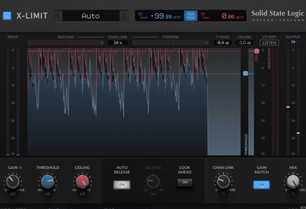 SSL X-limit AutoGain:13.2dB Threshold: -8.4 Ceiling: -1.0dB Auto Release ( Drum)