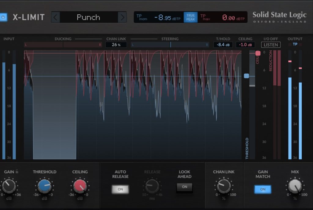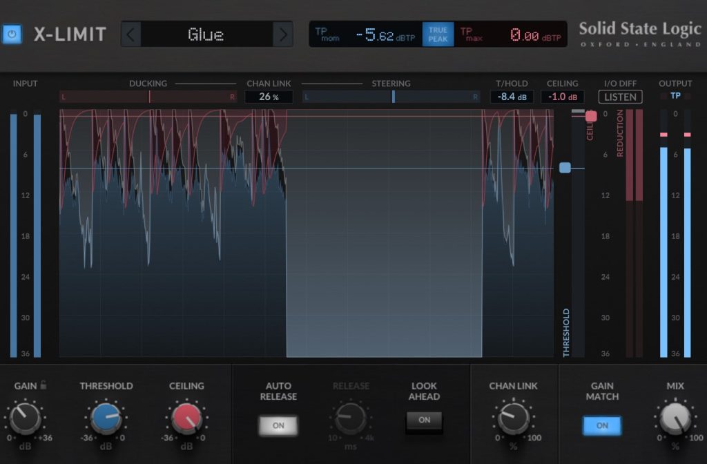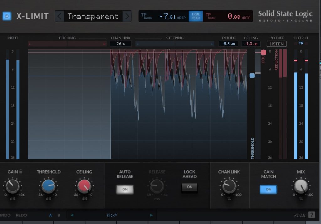 SSL X-limit Transparent Gain:13.2dB Threshold: -8.4 Ceiling: -1.0dB Auto Release ( Drum)
