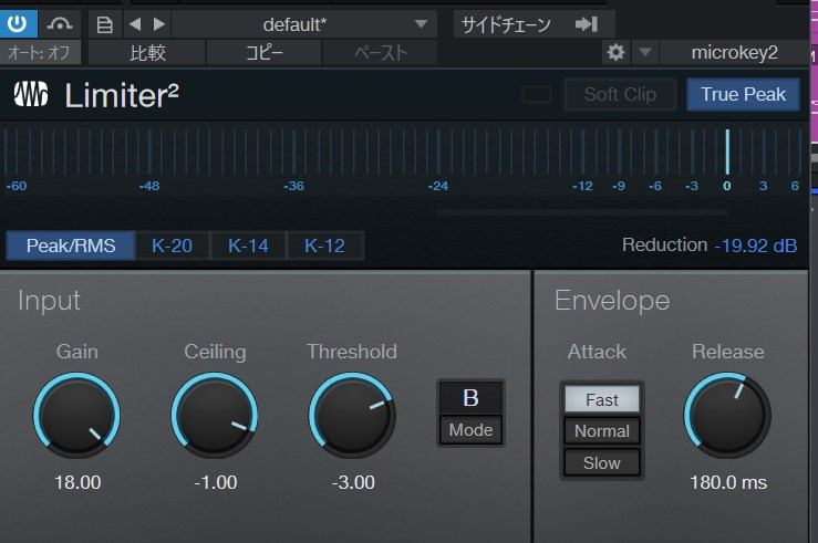 リミッターが効き始めるThresholdを設定後、CEILINGを決めてこれ以上音量が上がらないようにします。(-1.0dB余裕をもっておけば問題ない)