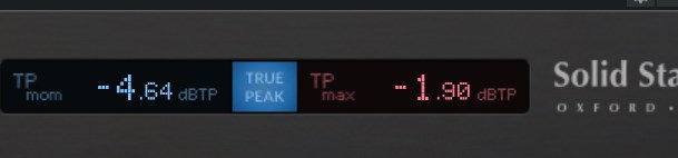 上にある「TRUE PEAK」のスイッチをいれると瞬間的なTRUE PEAK値と最大のTRUE PEAK値が GUI の上部に表示されます。SSL X-limitをかけたあとのトゥルーピーク値を確認できます。