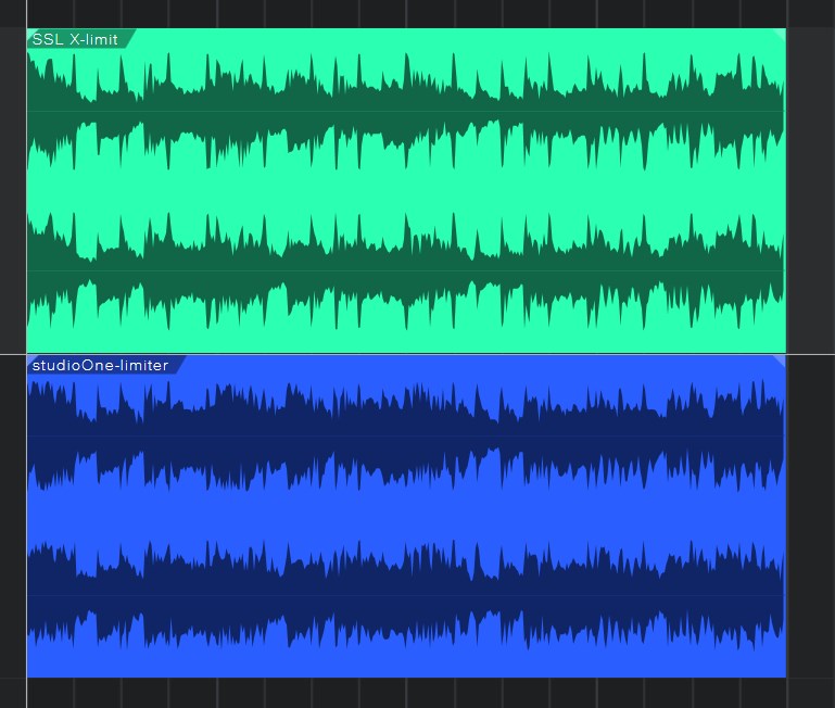 上のサンプルを波形で並べると下の画像のようになります。StudioOne Limiter2は音の質感にかなり変化があります。