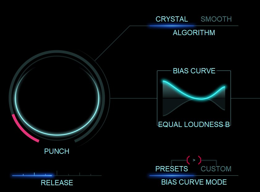 左側のPUNCHセクションがトランジェントシェイパー。持ち上げていくとBIAS CURVEで設定した帯域がぐっと前に出来聞こえます。