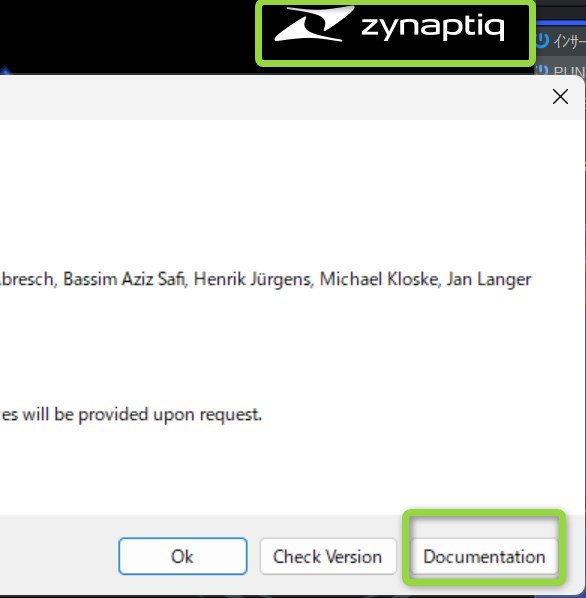右上のZynaptiqロゴを押してから出てくるウィンドウの「Documentation」のボタンを押します。