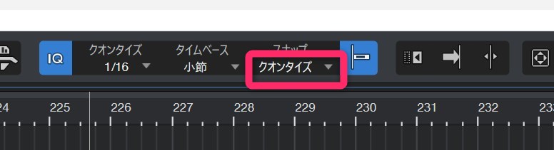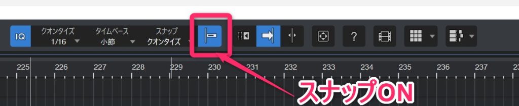 ここで「小節」を選ばないと小節の頭にスナップしません。