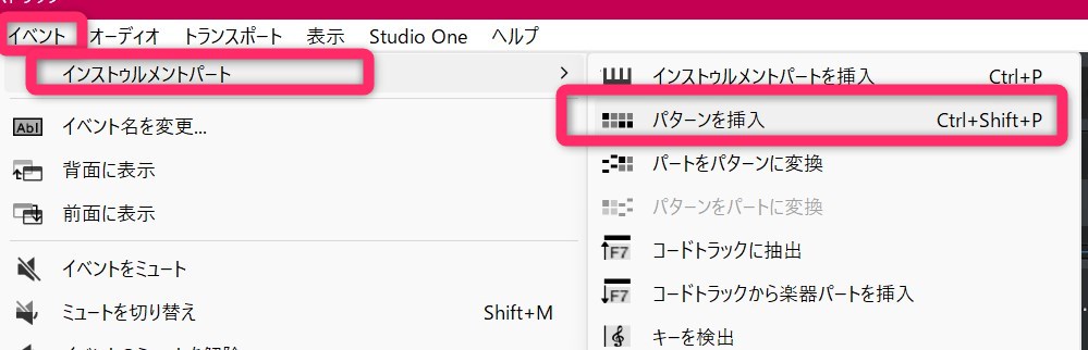 [2] メニュー > イベント > インストゥルメントパート > パターンを挿入 を選びます。