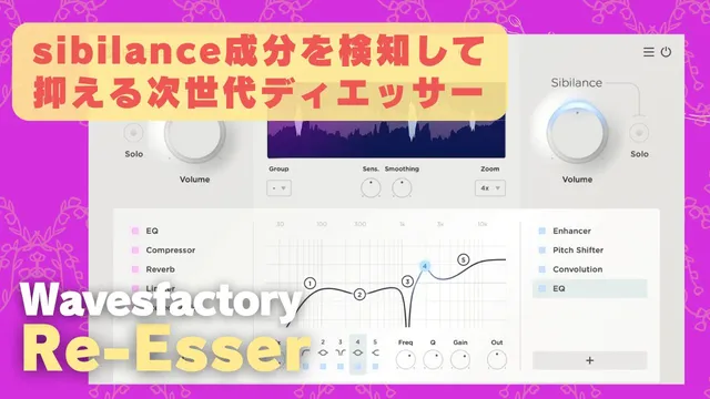 Wavesfactory Re-Esserは、ボーカルやダイアログのsibilanceを精密にコントロールするためのオーディオプラグインです。従来のde-esser(エス音を抑えるためのコンプレッサー的なツール)と違って、単に音量を下げるだけじゃありません。