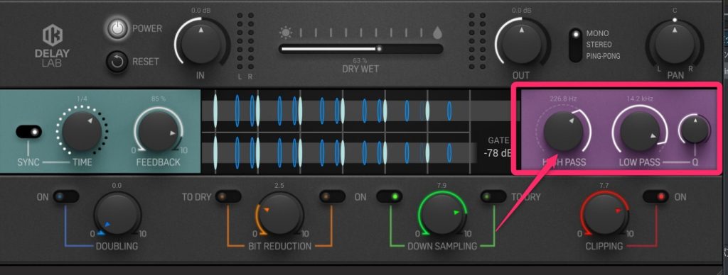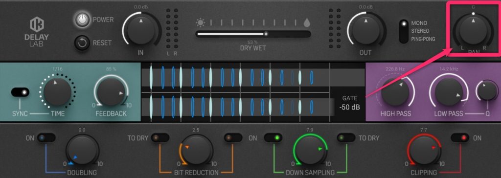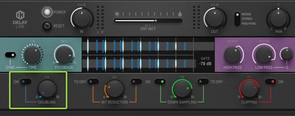 通常のディレイと異なる点としてダブリング、ビットクラッシュなどディレイの音を劣化加工できる様になっているのがこのプラグインの個性的な点。